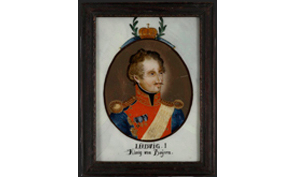 Hinterglasmalerei Porträt Ludwig I., König von Bayern. Reinigung des Objektes, Festigung loser Malschichten, Sicherung und Klebung der Scherben, Retusche von Fehlstellen. Vorzustand, Zwischenzustand, Nachzustand.Abbildung mit freundlicher Genehmigung des Historischen Museums der Pfalz Speyer, Inv.-Nr. B.S.2574, Foto: Melanie Konrad, 2009.