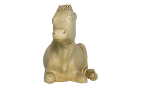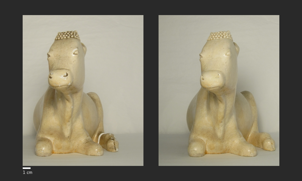 Gipsfigur „Kuh“ von Adolf Sautter. Reinigung der Oberfläche, Klebung der Bruchstelle, Retusche von Fehlstellen der Fassung. Vorzustand, Nachzustand.Abbildung mit freundlicher Genehmigung des Stadtmuseums Pforzheim, Foto: Lucie Selb & Melanie Konrad GbR, 2015.
