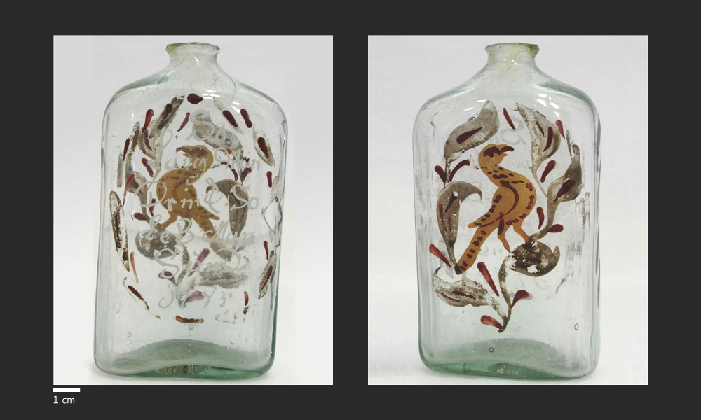 Schnapsflasche der Sammlung Spiegelhalder, Glas mit Emaille-Bemalung, Aufschrift „Solange man drinkt, so leb man sund 1785“. Reinigung der Oberfläche und Festigung der Bemalung. Vorder- und Rückseite im Nachzustand. Abbildung mit freundlicher Genehmigung des Franziskanermuseums Villingen- Schwenningen, Inv.-Nr. 7026, Foto: Melanie Konrad, 2015.