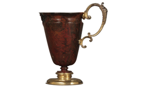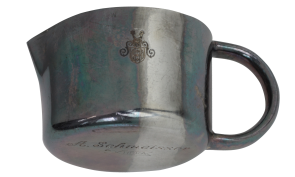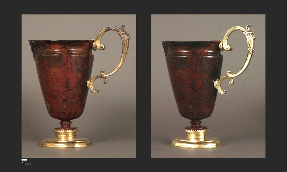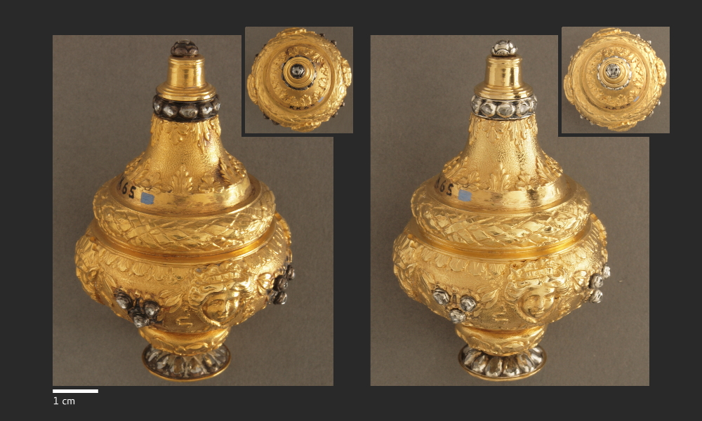 Zierkanne aus Stein und vergoldetem Silber. Reinigung der Oberfläche, Korrosionsabtrag. Vorzustand, Nachzustand. Eigentum des Landesmuseums Württemberg, Inv.-Nr. KK grün 133. Abbildung mit freundlicher Genehmigung des Eigentümers, Foto: Lucie Selb & Melanie Konrad GbR, 2015.