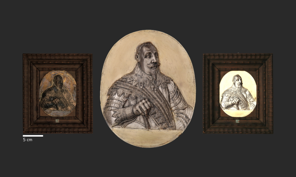 Silberrelief Gustav Adolf. Reinigung der Oberfläche, Korrosionsabtrag. Vorzustand, Zwischenzustand, Nachzustand. Eigentum des Landesmuseums Württemberg, Inv.-Nr. KK hellblau 67. Abbildung mit freundlicher Genehmigung des Eigentümers, Foto: Lucie Selb & Melanie Konrad GbR, 2015.