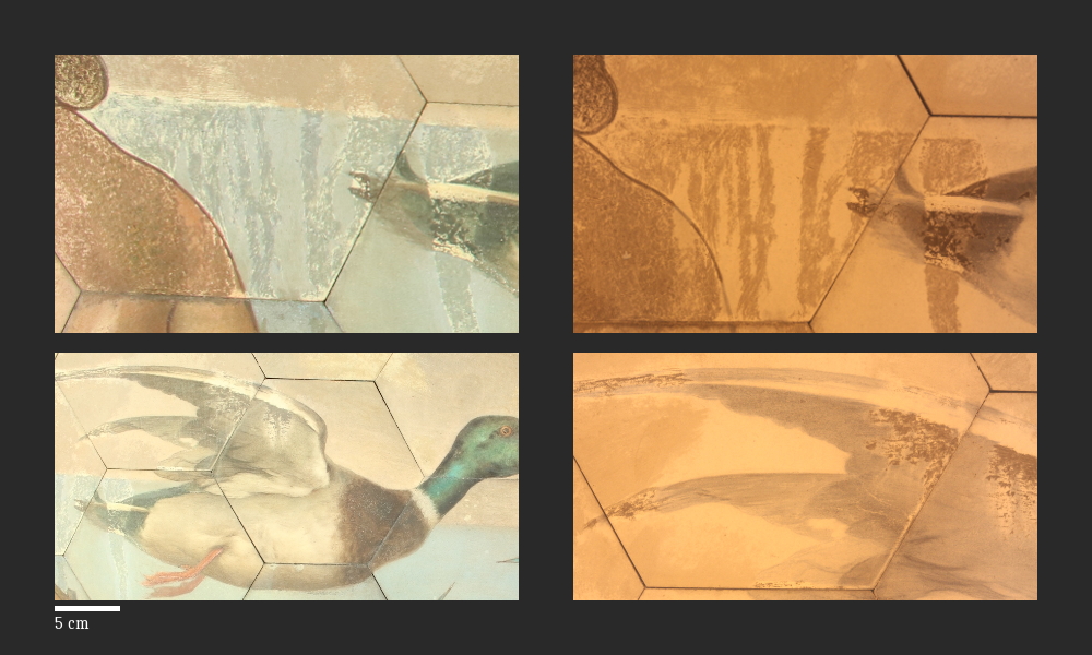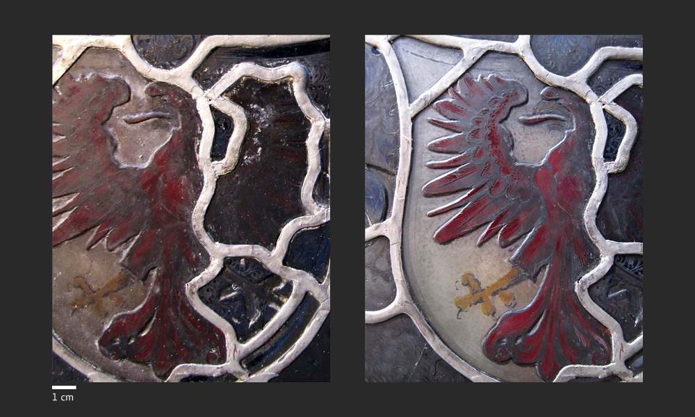 Kabinettscheibe „Wappenscheibe“, 16. Jh. Klebung und Verfüllung offener Fugen zwischen Glas und Bleiruten. Detailaufnahme im Vor- und Nachzustand.Abbildung mit freundlicher Genehmigung des Franziskanermuseums Villingen-Schwenningen, Inv.-Nr. 11858, Foto: Lucie Selb & Melanie Konrad GbR, 2015.