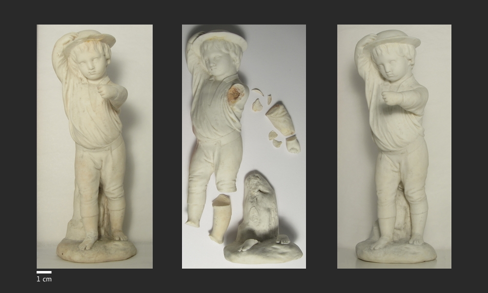 Porzellanfigur, Biskuitporzellan der Manufacture royale de porcelaine de Sèvres. Reinigung, Abnahme alter Sicherungsmaterialien, Neuverklebung, Kittung von Fehlstellen. Vorzustand, Zwischenzustand, Nachzustand.Abbildung mit freundlicher Genehmigung der Bayerischen Verwaltung der staatlichen Schlösser, Gärten und Seen, Inv.-Nr. Res Mü Kl Sèv 5, Foto: Lucie Selb & Melanie Konrad GbR, 2015.