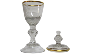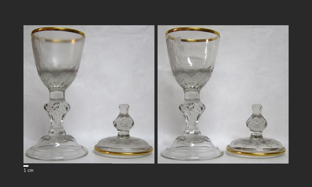 Kelchglas mit Deckel. Reinigung der Oberfläche zur Verringerung des Fortschreitens der Glaskorrosion. Vorzustand, Nachzustand. Eigentum des Landesmuseums Württemberg, Inv.-Nr. 1991-285 x. Abbildung mit freundlicher Genehmigung des Eigentümers, Foto: Lucie Selb & Melanie Konrad GbR, 2015.