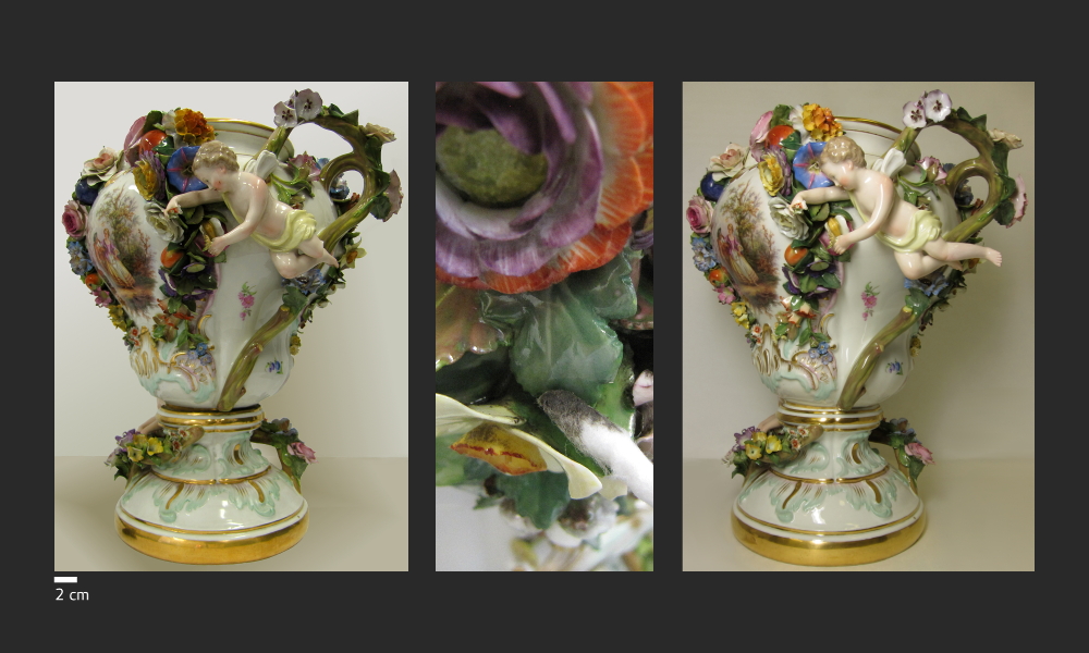 Korpus einer Potpourrivase aus der Porzellanmanufaktur Meissen. Reinigung der Oberfläche, Abtrag von gealterten Retuschen, Ergänzung des fehlenden Beines des schwebenden Putto, Retusche von Fehlstellen. Vorzustand, Detailaufnahme während der Reinigung, Nachzustand. Eigentum der Städtischen Museen Heilbronn, Meissener Prunkvase (Duftvase/Potpourri), Meissen 1850-1880, Slg. Becker-Franck, Inv.-Nr. 9218A/07. Abbildung mit freundlicher Genehmigung des Eigentümers, Foto: Lucie Selb & Melanie Konrad GbR, 2016.