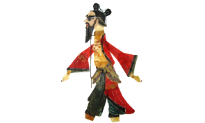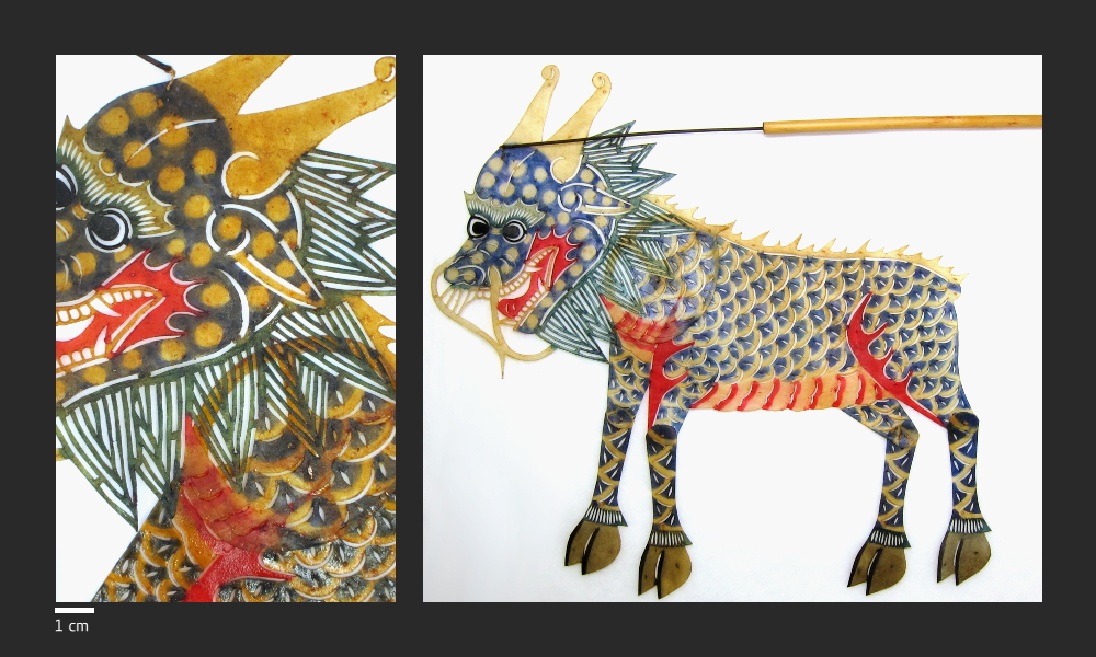 Chinesische Schattenspielfigur aus Pergament. Reinigung der Oberfläche, Abtrag einer historischen Fettung und Lösen der einhergehenden Verklebung der beweglichen Glieder. Detailaufnahme im Vor- und Nachzustand, Gesamtaufnahme im Nachzustand. Privatbesitz, Abbildung mit freundlicher Genehmigung des Eigentümers, Foto: Lucie Selb & Melanie Konrad GbR, 2016.