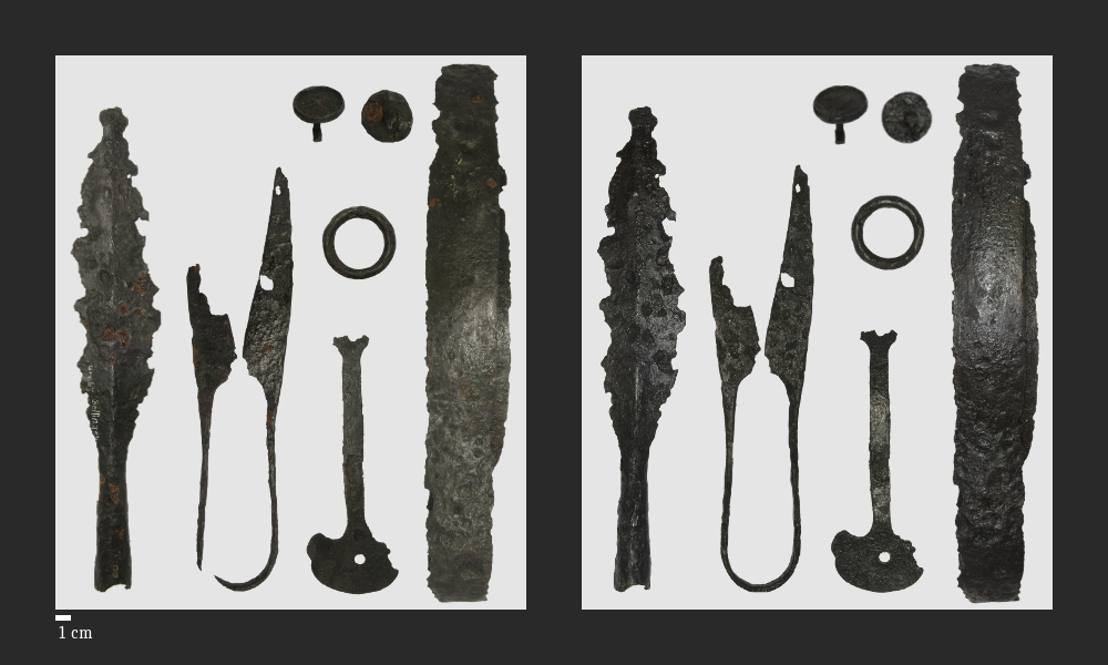 Keltische Grabbeigaben aus Eisen, Lanzenspitze, Schere, Ziernägel, Ring, Schildfessel, Schwert (gebogen), Bergung 1949. Abnahme anhaftender Konservierungsmittel, Eisenentsalzung und Bearbeitung für Präsentationszwecke. Vorzustand, Nachzustand. Abbildung mit freundlicher Genehmigung des Badischen Landesmuseums Karlsruhe, Inv.-Nr. 2016/10, 2016/11, 2016/13, 2016/14, 2016/16 und 2016/21, Foto: Lucie Selb & Melanie Konrad GbR, 2016/ 2017.