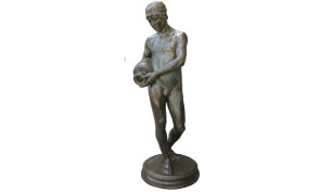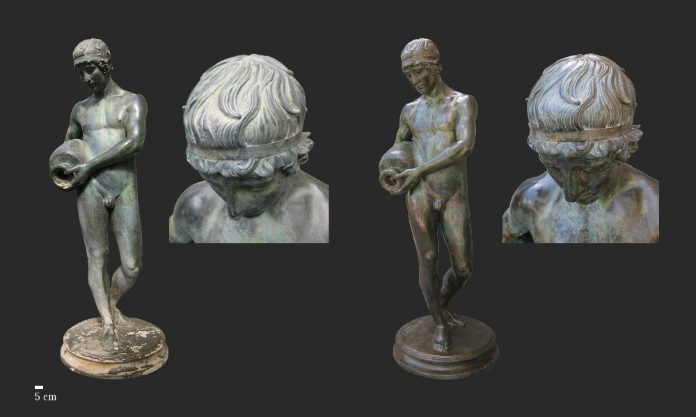 Brunnenskulptur „Jüngling mit Vase“ von G. G. Schreÿögg, Kupferlegierung, Guss H. Klement, München 1899. Reinigung der Oberfläche, Abnahme von Anhaftungen, Sicherung von Fehlstellen, Auftrag eines Schutzüberzugs. Vor- und Nachzustand mit Detailaufnahme.Abbildung mit freundlicher Genehmigung der Staatlichen Kunsthalle Karlsruhe und Vermögen und Bau Baden-Württemberg, Foto: Lucie Selb & Melanie Konrad GbR, 2016.