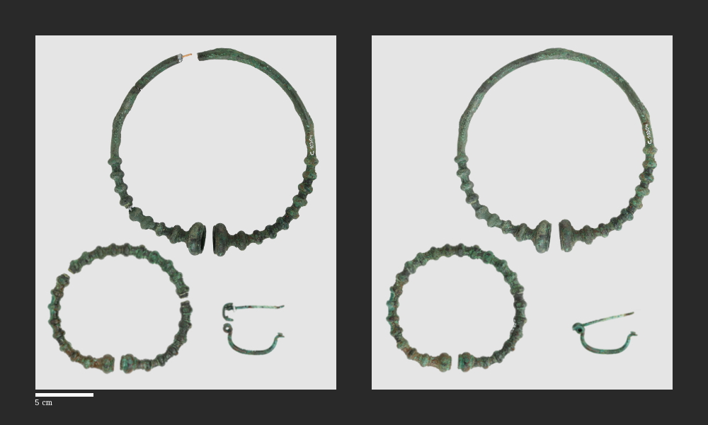 Halsreif, Armreif und Fibel, Kupferlegierung. Überarbeitung der Altrestaurierung, Klebung von Brüchen und partielle Stabilitätsergänzung. Vorzustand, Nachzustand. Abbildung mit freundlicher Genehmigung des Badischen Landesmuseums Karlsruhe, Inv.-Nr. C10304, C2622, R1654a, Foto: Lucie Selb & Melanie Konrad GbR, 2018/ 2019.