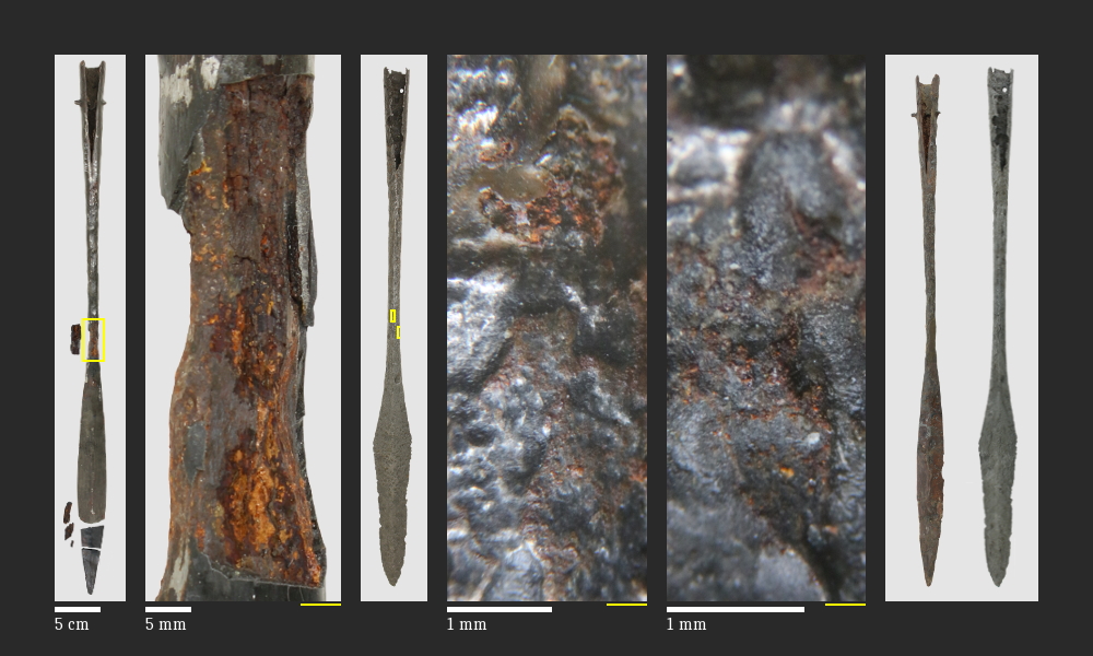Lanzenspitzen aus Eisen. Abnahme vorliegender Konservierungsmittel, Eisenentsalzung und Bearbeitung für Präsentationszwecke. Vorzustand mit Detailaufnahme und Mikroskopaufnahmen: orangebraune Bläschen „weeping iron" und Abplatzungen der Oberfläche weisen auf eine Belastung mit Chloriden und ein Fortschreiten der Korrosion hin, Nachzustand. Abbildung mit freundlicher Genehmigung des Badischen Landesmuseums Karlsruhe, Inv.-Nr. Kle6/7 und C3481, Foto: Lucie Selb & Melanie Konrad GbR, 2018/ 2019.