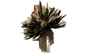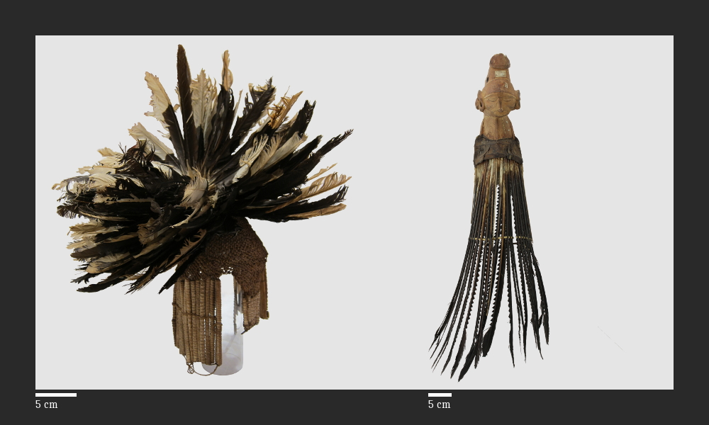 Federkopfschmuck aus Afrika und Nackenmaske aus der Südsee, Pflanzenfasern, Federn. Reinigung und Sicherungsmaßnahmen. Nachzustand. Abbildung mit freundlicher Genehmigung des Museums im Ritterhaus, Offenburg, Inv.-Nr. OF2523, OF2627, Foto: Lucie Selb & Melanie Konrad GbR, 2017/ 2019.
