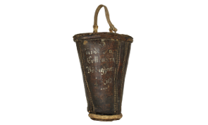 Löscheimer aus Leder, Aufschrift „Rüdt von Collenberg Bödigheim 1850“. Konditionierung der Materialfeuchte, Reinigung der Oberfläche, Festigung der historischen Beschriftung, Sicherung von Nähten und einzelnen Rissen. Nachzustand.Abbildung mit freundlicher Genehmigung des Vereins Bezirksmuseum e.V. Buchen, Inv.-Nr. 6356, 7138, 7139 und 7140, Foto: Lucie Selb & Melanie Konrad GbR, 2018.