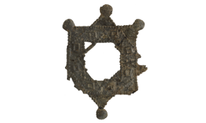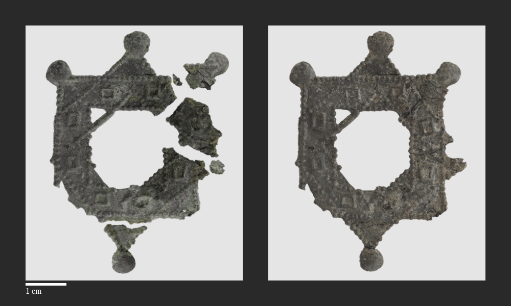 Mantelschließe, Hutagraffe oder Pilgerzeichen, Zinn, Bergung 1926-1929, Burgruine Lützelhardt, Grabung Karl Hammel. Abnahme vorliegender Konservierungsmittel, Klebung von Brüchen und partielle Stabilitätsergänzung. Vorzustand, Nachzustand. Abbildung mit freundlicher Genehmigung der Gemeinde Seelbach, Dr. Heiko Wagner und Dr. Niklot Krohn, Inv. Nr. H72/274 Foto: Lucie Selb & Melanie Konrad GbR, 2019.