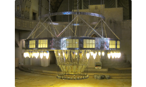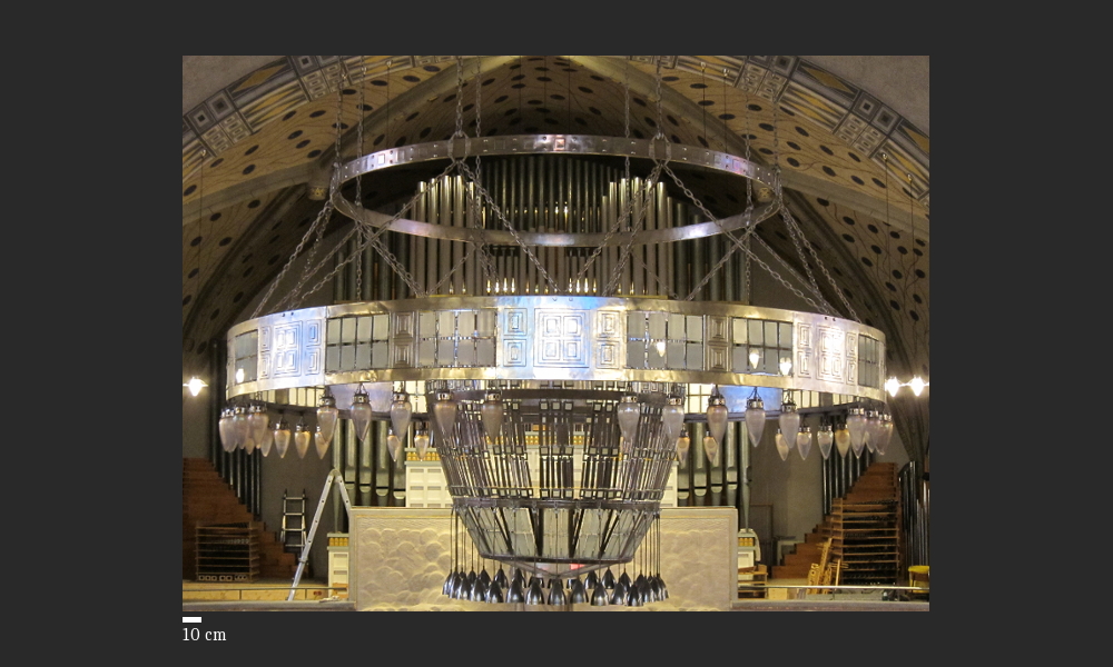 Leuchten der Lutherkirche Karlsruhe, Neusilber, Glas, um 1907. Reinigung der Oberfläche, Abnahme von gealterten Schutzüberzügen und Korrosionsprodukten, Erneuerung der Korrosionsschutzbeschichtung. Kronleuchter im Nachzustand.Abbildung mit freundlicher Genehmigung der Evangelische Kirche in Karlsruhe, der Evang. Kirchenverwaltung und der Büro für Baukonstruktionen GmbH, Foto: Lucie Selb & Melanie Konrad GbR, 2018.