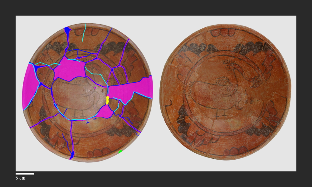 Tonschale der Maya, Yucatán, Mexiko. Bestandsaufnahme, Schadenserfassung und Überarbeitung der Altrestaurierung. Kartierung des Bestandes und Vorzustandes, Nachzustand.Abbildung mit freundlicher Genehmigung der Städtischen Museen Freiburg, Museum Natur und Mensch, Ethnologische Sammlung, Inv.-Nr. III/1882, Foto: Lucie Selb & Melanie Konrad GbR, 2017/2019.