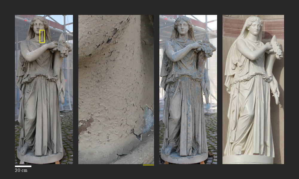 Frauenfiguren der Rotunde des Vierordtbades Karlsruhe, Zinkguss mit Farbfassung, um 1872. Reinigung der Oberfläche, Festigung anhaftender Farbschichten, Beschichtung der Oberfläche. Vorzustand mit Detailaufnahme, Zwischenzustand, Nachzustand.Abbildung mit freundlicher Genehmigung der Stadt Karlsruhe, Bäderbetriebe und des Architekturbüros Behrens, Landau, Foto: Lucie Selb & Melanie Konrad GbR, 2018/ 2019.