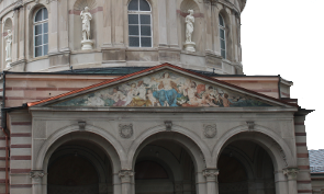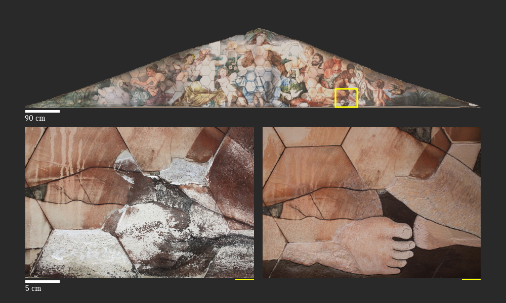 Fliesengemälde „Hygieia“ am Giebel des Vierordtbades Karlsruhe, Lithokaustik, 1892. Reinigung der Oberfläche mit partieller Abnahme von gealterten Retuschen, partielle Festigung von aufliegenden Farbschichten, Ergänzung von Fehlstellen und Retusche. Gesamtaufnahme im Vorzustand, Detailaufnahme im Vor- und Nachzustand.Abbildung mit freundlicher Genehmigung der Stadt Karlsruhe, Bäderbetriebe und des Architekturbüros Behrens, Landau, Foto: Lucie Selb & Melanie Konrad GbR, 2018/ 2019.