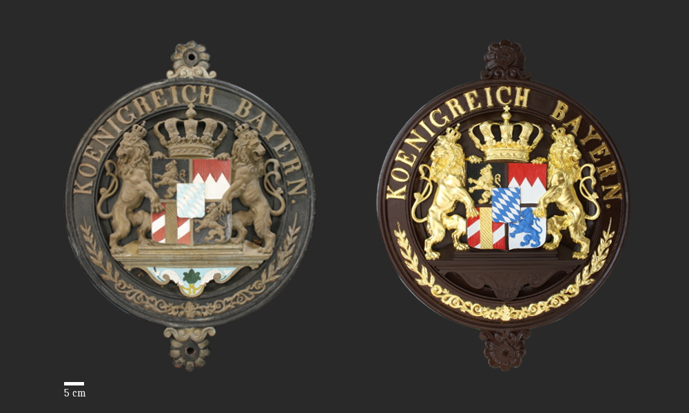 Grenzschild in Form eines Wappens, Gusseisen, vermutlich zwischen 1835-1918. Abnahme nicht originärer Fassungsschichten, Entfernung von Korrosion und Rekonstruktion der historischen Fassung. Vorzustand, Nachzustand.Abbildung mit freundlicher Genehmigung der Stadt Kandel, Foto: Lucie Selb & Melanie Konrad GbR, 2018/ 2019.