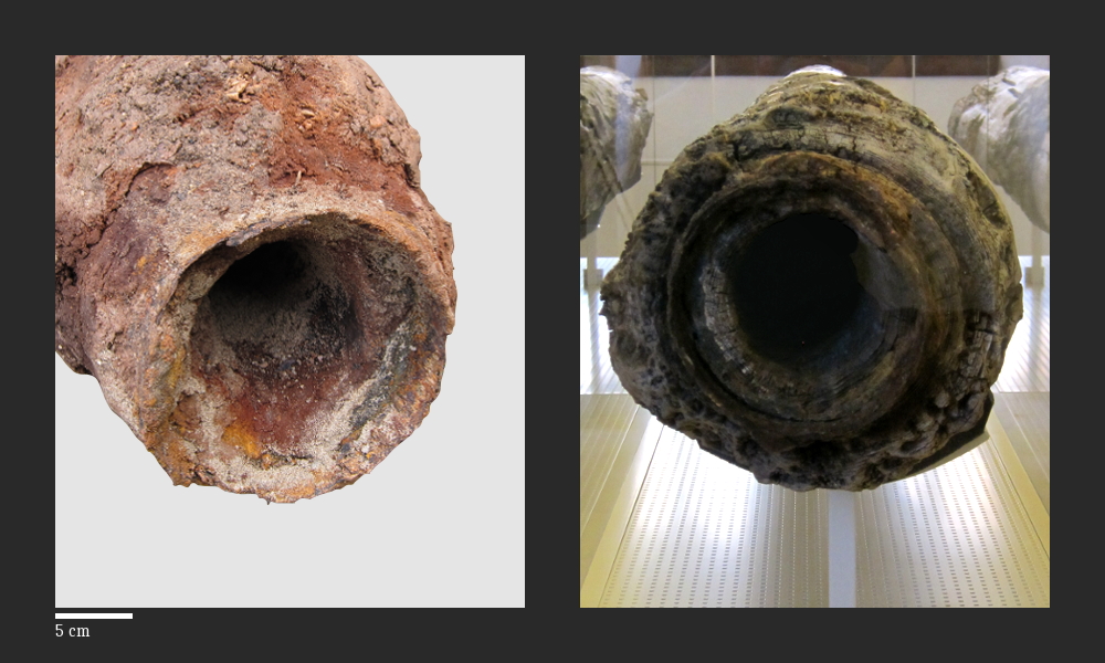 Hölzerne Wasserrohre, Karlsruhe-Durlach, Kiefer gefällt 1640/41, Bergung 2015. Reinigung, Sicherung der Rinde und kontrollierte atmosphärische Lufttrocknung. Detailaufnahme im Vor- und Nachzustand.Abbildung mit freundlicher Genehmigung des Pfinzgaumuseums, Karlsruhe, der Stadtwerke Karlsruhe und des Freundeskreises Pfinzgaumuseum - Historischer Verein Durlach e.V., Foto: Lucie Selb & Melanie Konrad GbR, 2015/ 2017.