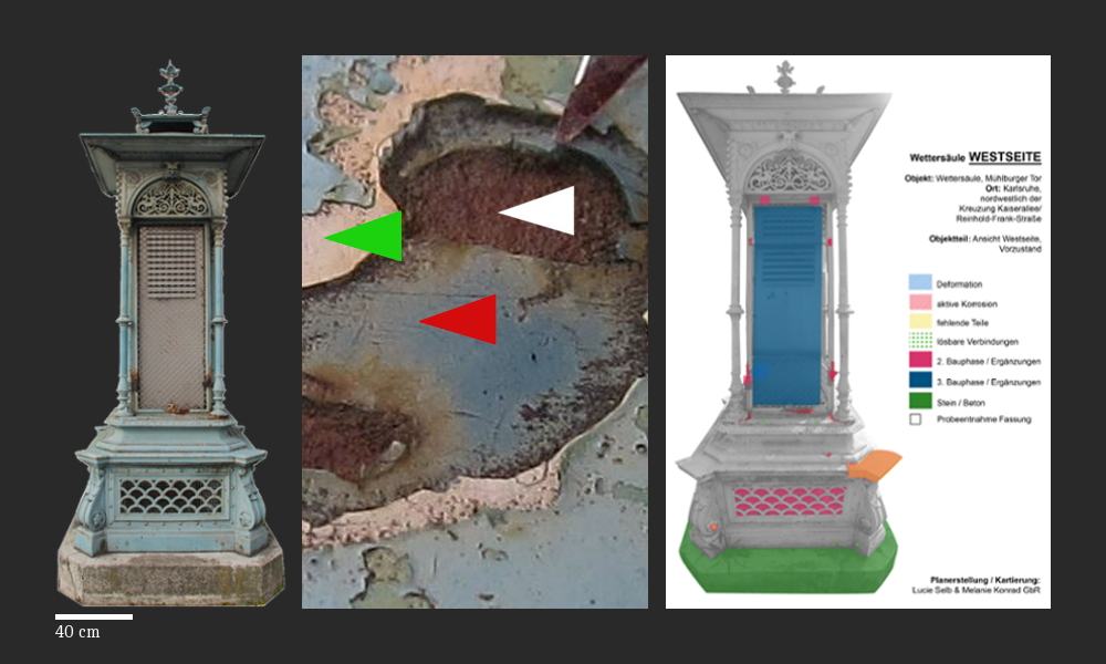 Wettersäule Karlsruhe, Eisenguss mit Farbfassung, Betonsockel, Mitte 19. Jh.. Reinigung und Neufassung der Oberfläche, Fassungsuntersuchung, Ergänzung von Fehlstellen. Südansicht der Wettersäule im Nachzustand, Querschliff der Fassungsschichten, Detailaufnahme einer Fehlstelle im Vor- und Nachzustand. Abbildung mit freundlicher Genehmigung der Stadt Karlsruhe, Gartenbauamt, Foto: Lucie Selb & Melanie Konrad GbR, 2020.