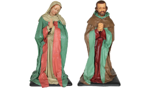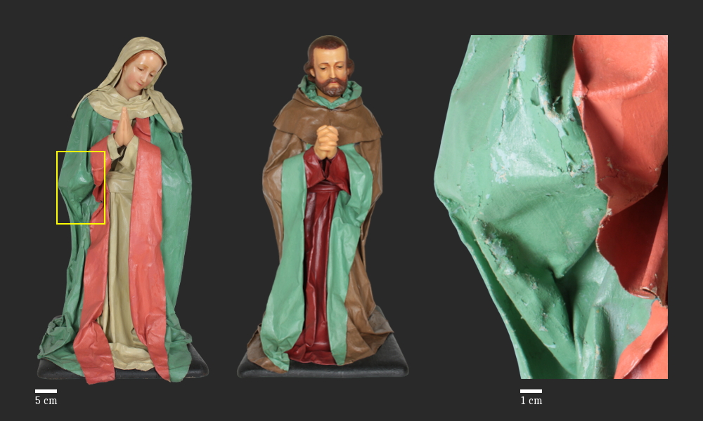Figurenpaar Hl. Maria und Hl. Josef, Textil, Wachs, Holz, Farbfassung. Reinigung der Oberfläche, Festigung der Farbfassung, Retusche von Fehlstellen. Hl. Maria und Hl. Josef im Nachzustand, Detailaufnahme Hl. Maria im Vorzustand.Abbildung mit freundlicher Genehmigung des St. Paulus Stifts, Herxheim, Foto: Lucie Selb & Melanie Konrad GbR, 2020/ 2021.