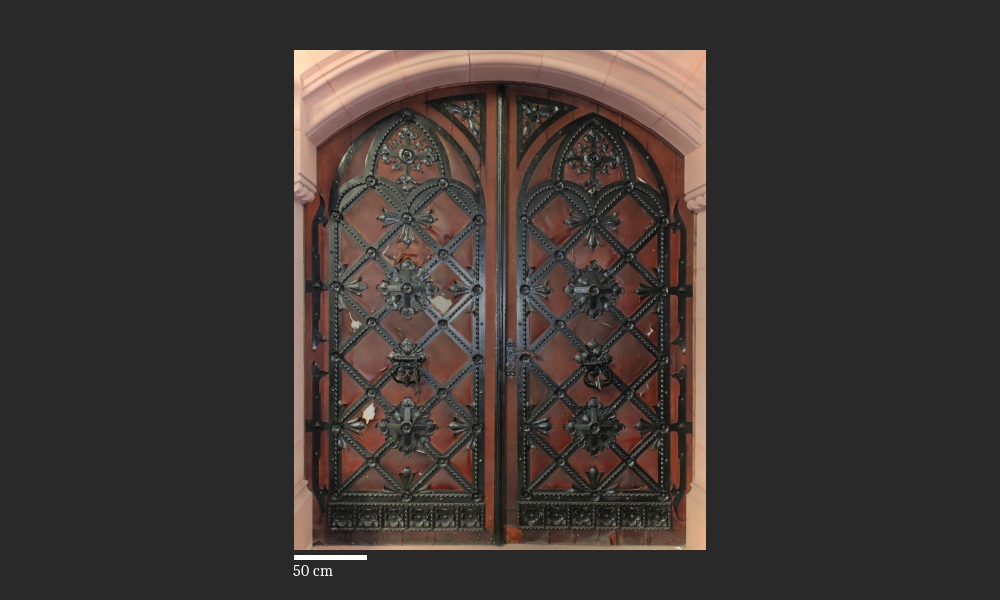 Gruft-Türe der Großherzoglichen Grabkapelle Karlsruhe, Holz, Leder und Schmiedeeisen, um 1890. Bestandsaufnahme, Schadenanalyse und Maßnahmenkonzept zur Erhaltung der Lederbespannung. Abbildung mit freundlicher Genehmigung der Staatlichen Schlösser und Gärten Baden-Württemberg, Foto: Lucie Selb & Melanie Konrad GbR, 2020.