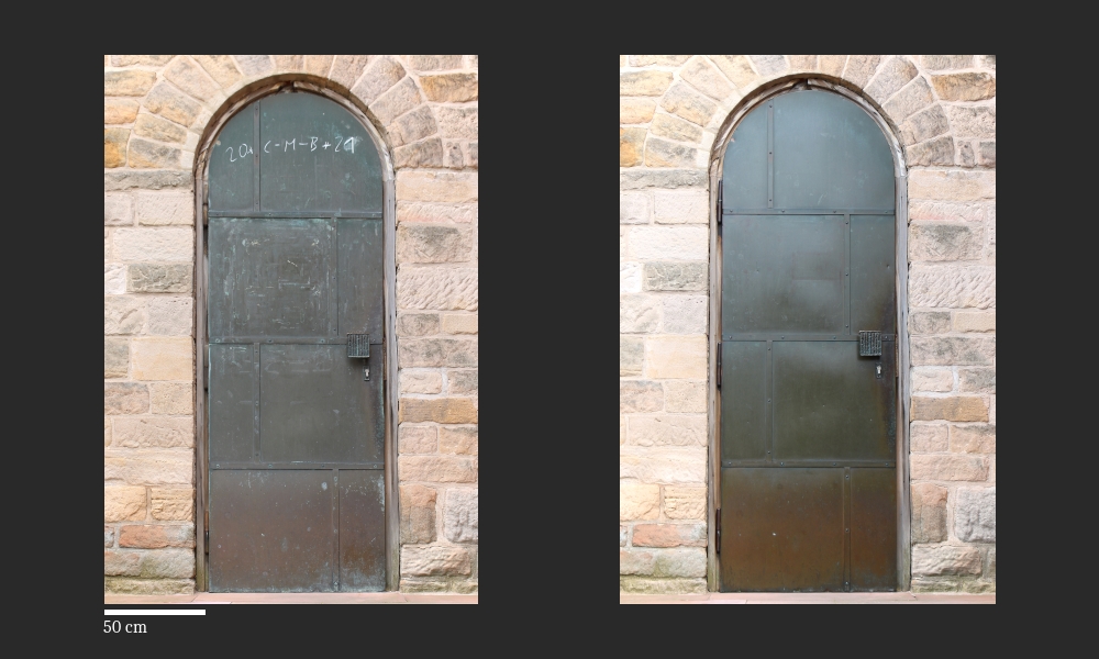 Portaltüre der Katholischen Kirchenstiftung St. Michael, Dannstadt-Schauernheim, Holz, Kupferblech. Reinigung der Portaltüren, Abnahme von Beschriftungen und Klebestreifenanhaftungen, Konservierung. Gesamtaufnahme Nord-Westportal im Vor- und Nachzustand. Abbildung mit freundlicher Genehmigung der Katholischen Kirchengemeinde Hl. Sebastian, des Bistums Speyer und des Architekturbüros Behrens, Landau, Foto: Lucie Selb & Melanie Konrad GbR, 2021.