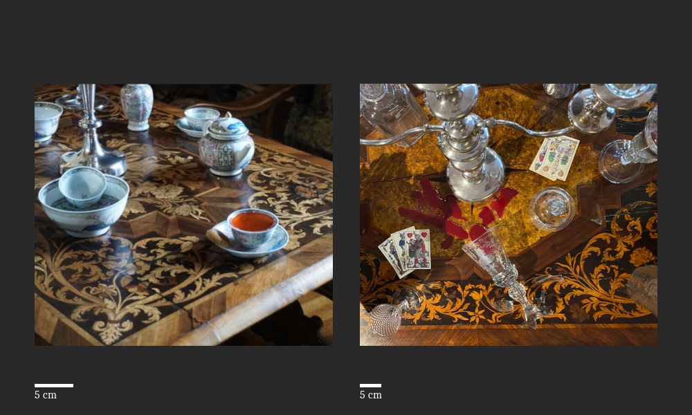 Rotwein- und Tee-Imitationen, für die „Schönen Gemächer“ in Schloss Weikersheim. Anfertigung der Imitationen aus Epoxidharz. Abbildung mit freundlicher Genehmigung der Staatlichen Schlösser und Gärten Baden-Württemberg, Foto: Veronika Nuding, Staatliche Schlösser und Gärten Baden-Württemberg, 2022.