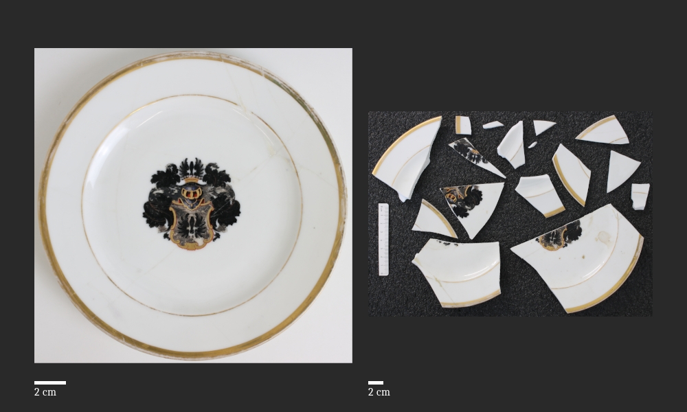 Teller, Porzellan mit Aufglasurmalerei, 19. Jh.. Reinigung, Klebung, Ergänzung. Vor- und Nachzustand. Privatbesitz, Abbildung mit freundlicher Genehmigung des Eigentümers, Foto: Lucie Selb & Melanie Konrad GbR, 2023.