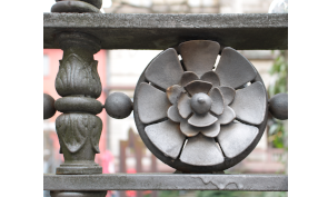 Zaungitter der Zaunanlage des Prinz-Max-Palais, Karlsruhe, Guss- und Walzeisen, 19. Jh.. Untersuchung der Metallausstattung, Erstellung eines Maßnahmenkonzeptes. Ausschnitt aus der Dokumentation der Zaunanlage, Kartierung von vier Zaunelementen. Abbildung mit freundlicher Genehmigung der Stadt Karlsruhe, Amt für Hochbau und Gebäudewirtschaft und der SPACE4 GmbH, Suttgart, Foto: Lucie Selb & Melanie Konrad GbR, 2021.