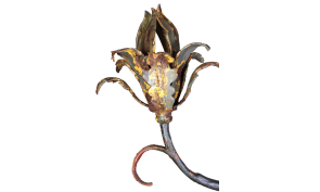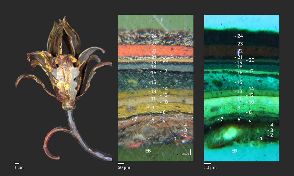 Wirtshausschild des Gasthauses "Zum Wilden Mann" aus Lörrach, Schmiedeeinsen, Farbfassung, Teilvergoldung, um 1830. Untersuchung der teils stark beschädigten historischen Farbfassung der Endigung in Blütenform. Detailaufnahme, Querschliff des Fassungsaufbaus, Auflichtmikroskopie und UV-Aufnahme. Abbildung mit freundlicher Genehmigung des Dreiländermuseums / Musée des Trois Pays Lörrach, Foto: Lucie Selb & Melanie Konrad GbR, 2022/ 2023.